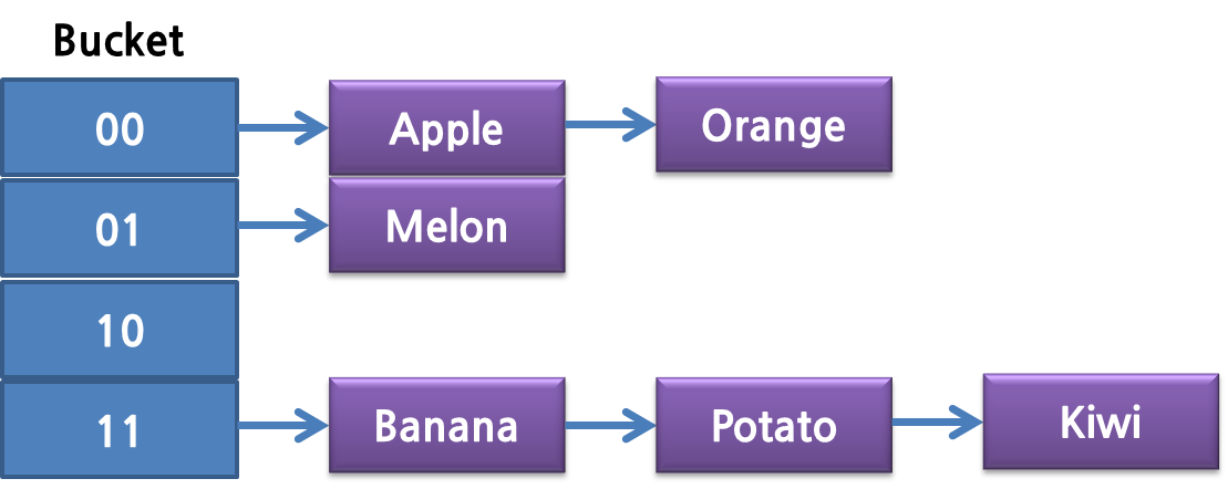- 같은 Bucket에 들어가는 key들은 링크드 리스트로 연결됨