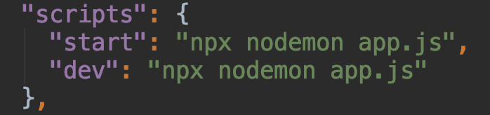 - npx로 실행시켜주는 이유는, 만약 글로벌 모듈(여기서는 nodemon)이 설치돼 있지 않다면 자기가 직접 글로벌 모듈을 다운로드하고 실행시켜줌