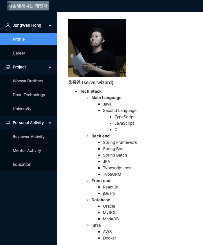 사실 교육에서는 노션을 만들고 있지만, 굳이 노션을 만들지 않아도 된다는 말씀을 해주셨기에 그동안 꼭 만들고 싶었던 개인 홈페이지를 아래와 같이 만들고 있다.