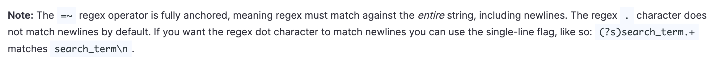 - 현상 이유 : loki query에서 정규표현식 오퍼레이터 '=~' 는 줄 바꿈(\n)을 포함하여 전체 문자열과 일치해야 검색이 되는데, 정규 표현식 ' . ' 문자는 기본적으로 줄 바꿈과(\n)이 있으면 일치하지 않는다고 판단한다. 이로 인해, 로그 메시지에 줄 바꿈이 포함된 경우 일치하지 않는다고 판단해서 검색이 안 됐던 이슈였다.