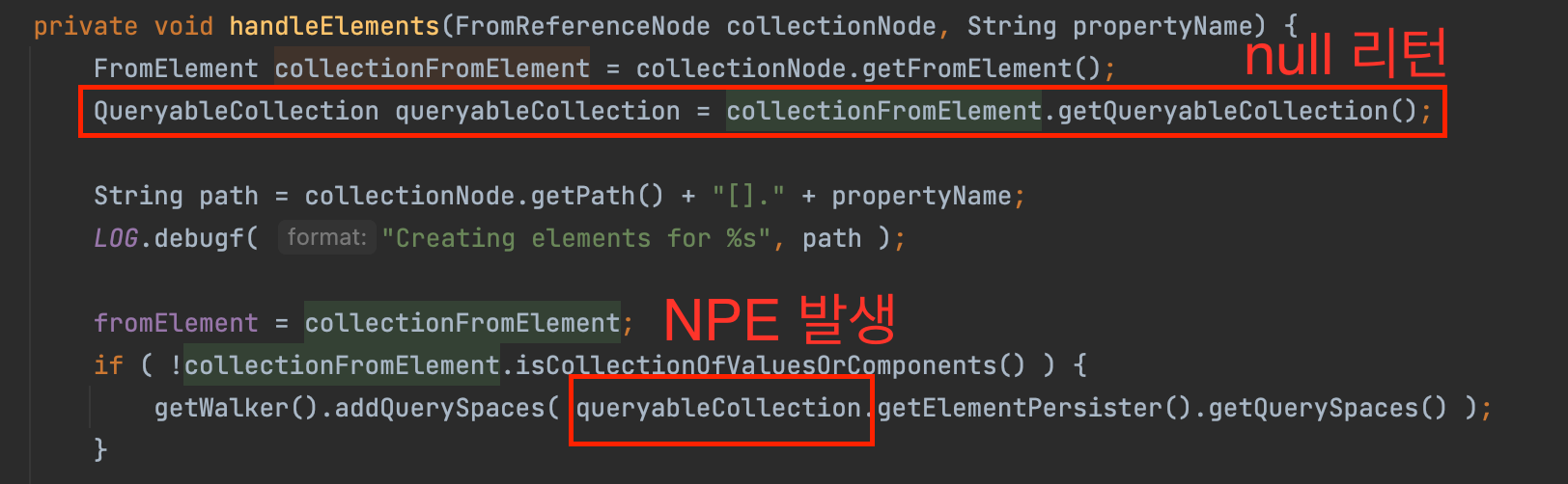 이에 코드를 분석해 봤더니 아래 빨간 네모에서 null 값을 리턴하고 있어서 NPE가 발생하고 있었다.