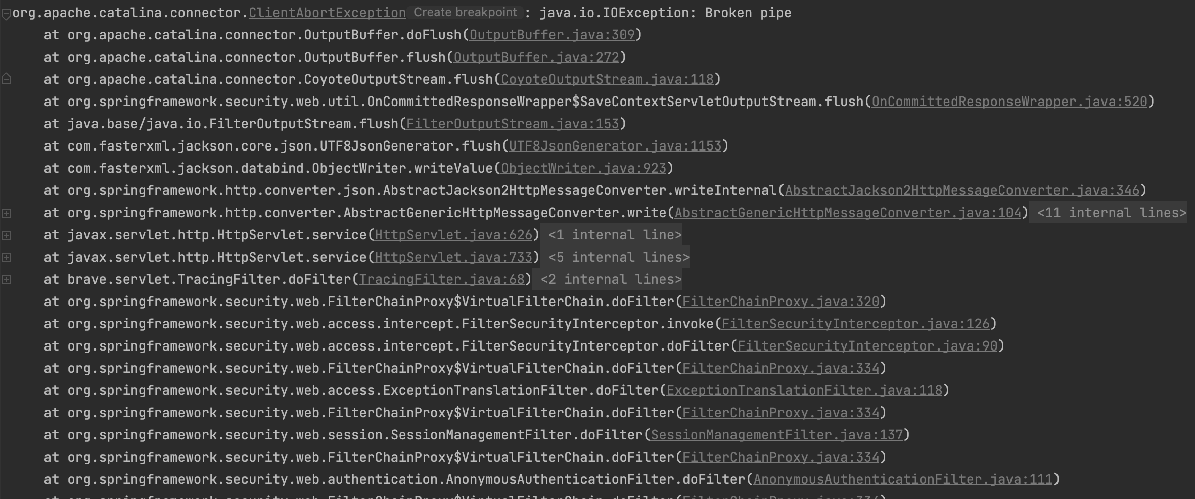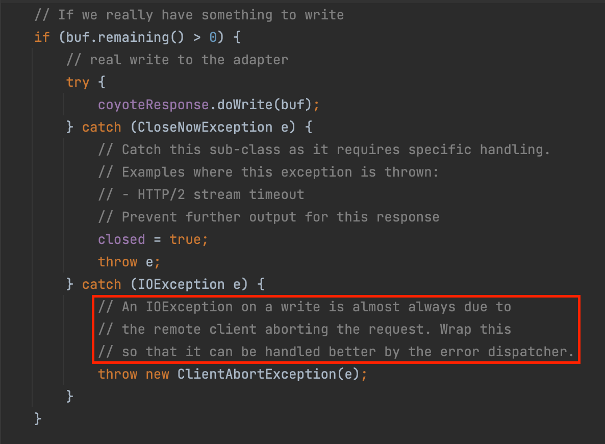 코드를 분석해보니 아래 빨간 네모 부분에서 Exception이 발생하고 있었고, 친절하게도 해당 부분에 주석이 적혀 있었는데 '쓰기에 대한 IO Exception은 거의 항상 요청을 중단하는 웹 클라이언트(브라우저 또는 REST 클라이언트) 때문'이라고 명시돼 있었다.