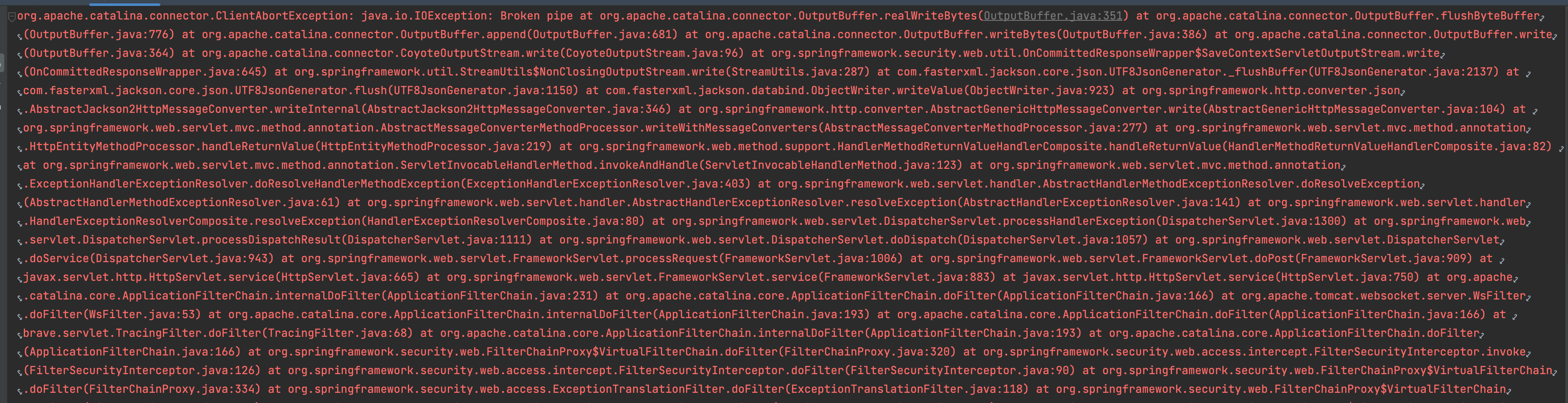 서비스 모니터링을 하다가 아래처럼 ClientAbortException(java.io.IOExceiption: Broken pipe)이 발생하고 있는 것을 확인했다. 이에 해당 Exception이 언제 발생하는지를 분석해 봤다.