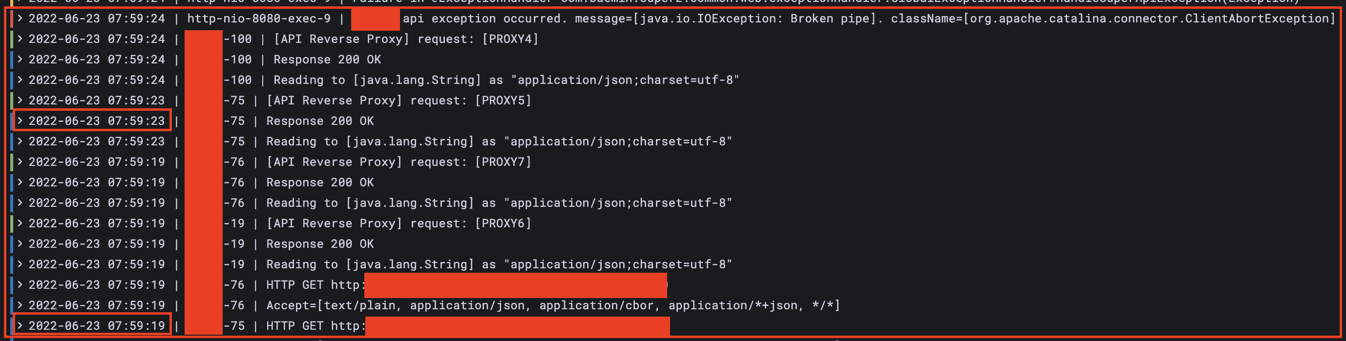 일단 해당 로그를 보면서 가장 눈에 띄었던 포인트는 특정 API를 호출하는데 4초가 걸리는 점과 예외 메시지에 org.apache.catalina.connector.ClientAbortException: java.io.IOException: Broken pipe이 있다는 점이었다.